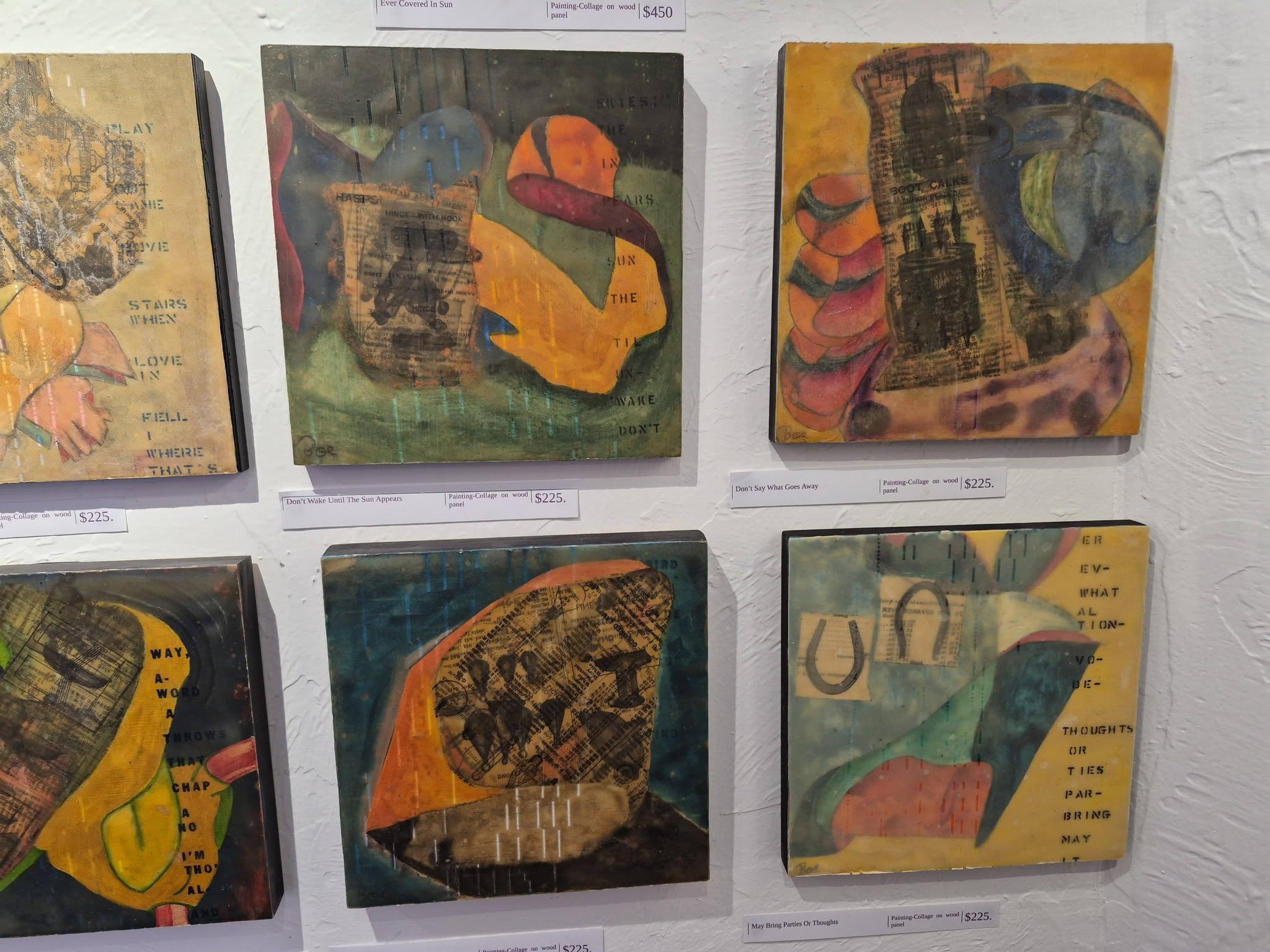 These collage paintings use 100+ year-old piano scroll as a semi-transparent and semiotic medium employing “note holes” and the “found poetry” cut-up scroll lyrics. PPPP also employ 1940s catalog paper and surrealist painting techniques within.