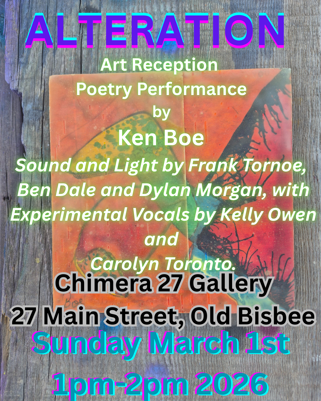 I’ll be performing live this Sunday on July 6th, 2025 from 1-3pm, and I hope you will join us if you are in Bisbee, Arizona. Earl’s Cafe is a really beautiful venue which is the back side of the The Warner Hotel which was recently renovated after sitting vacant for more than half a century. Ben Dale is a sculptor who builds his sound instruments, and you’ll see some of his commissioned figurative copper sculptures right outside Earl’s Cafe off of Subway Street. That’s how you know you’re headed in the right direction. Dylan Morgan is a renowned expressionist painter, and poet, who also plays the cello and simultaneously the keyboards with his feet. This celebration will be a fundraiser for the Bisbee Poetry Normalization Project which I’m bringing out of the mothballs to counter the zombie normalization going on these days. I began it in late 2017. Please support. which you can also do at patreon.com/kenboe where I also have my Poem At Night series, putting up new poems for every night.